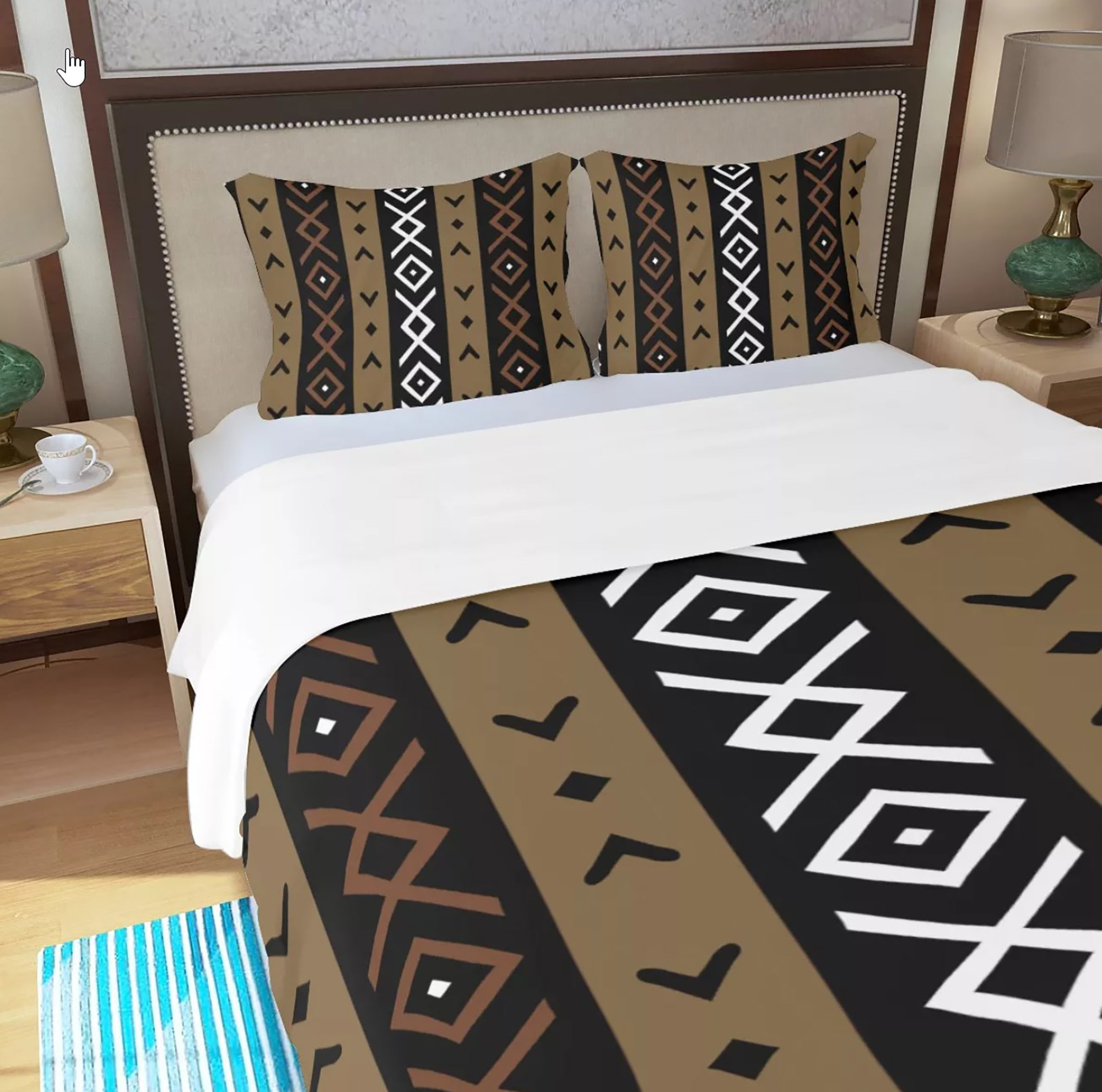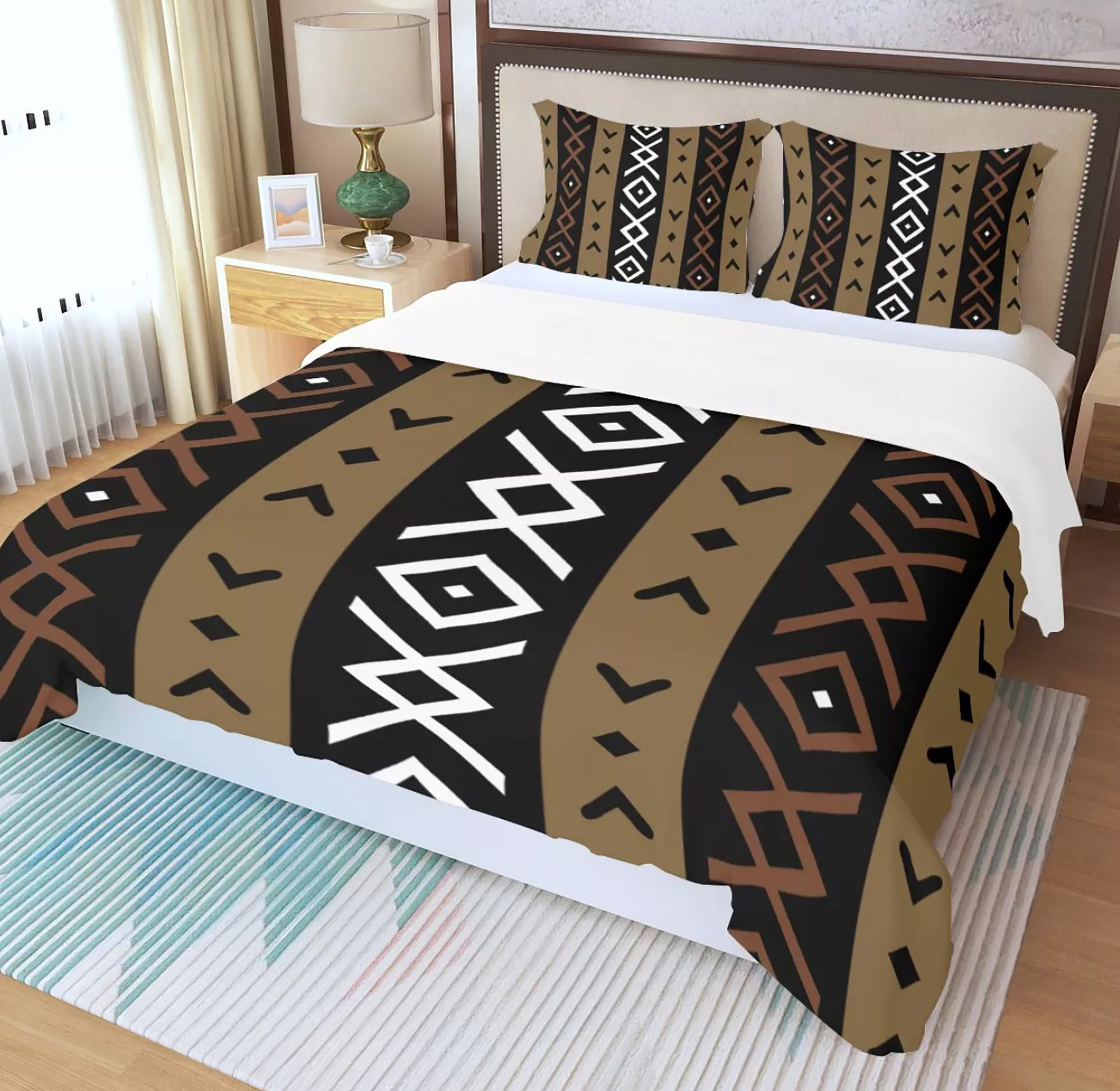 Lovely printed Mali mud cloth inspired three-piece duvet set. This striking African mud cloth adorned printed duvet bed set comes with 1 zip-up duvet cover and 2 pillow cases. The duvet and pillow cases are printed on one side only (the back side is white). The fabric is soft, non-irritating moisture absorption, breathable polyester. Insert your favorite quilt or comforter into this duvet cover and enjoy the great feel while making your bedroom looking astonishing!