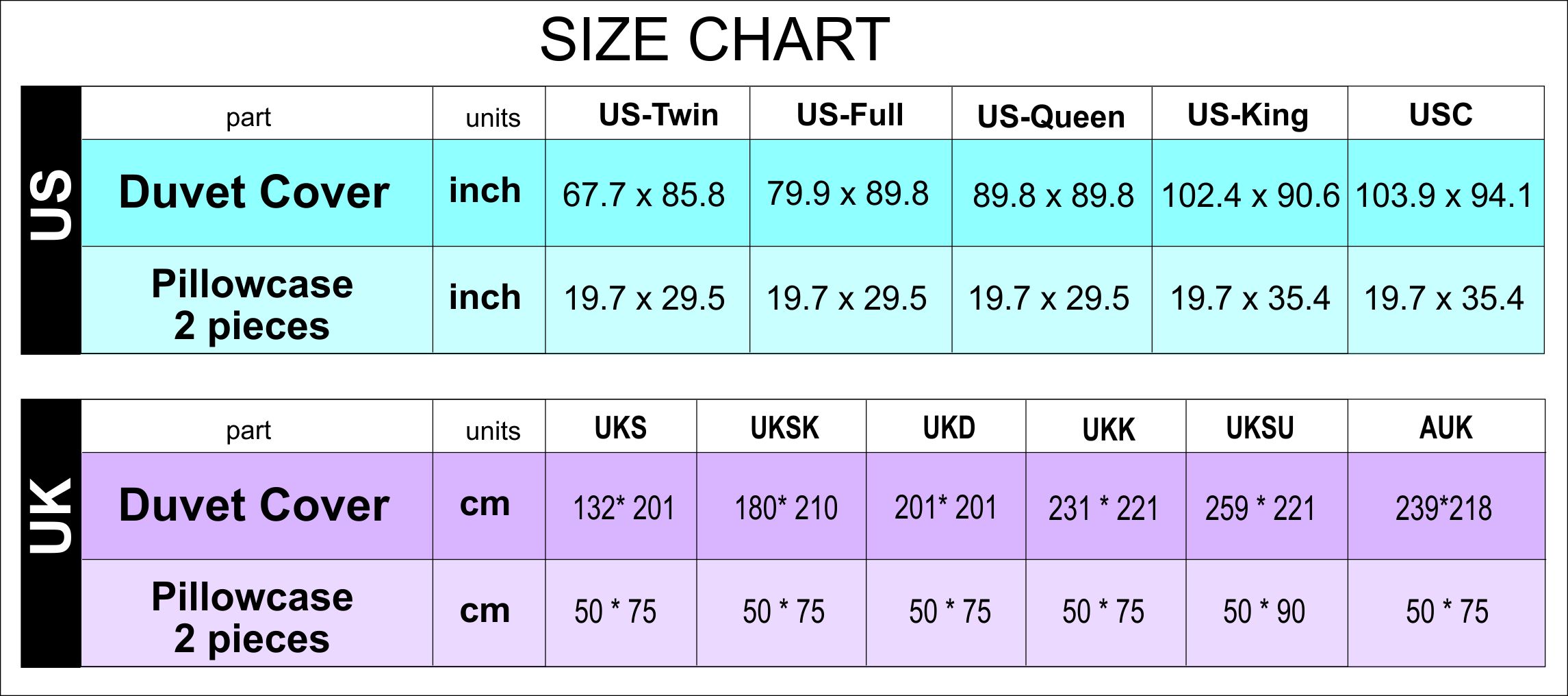 Please carefully check the size guide for your correct bed size. Sizes are offered in US and UK sizes.