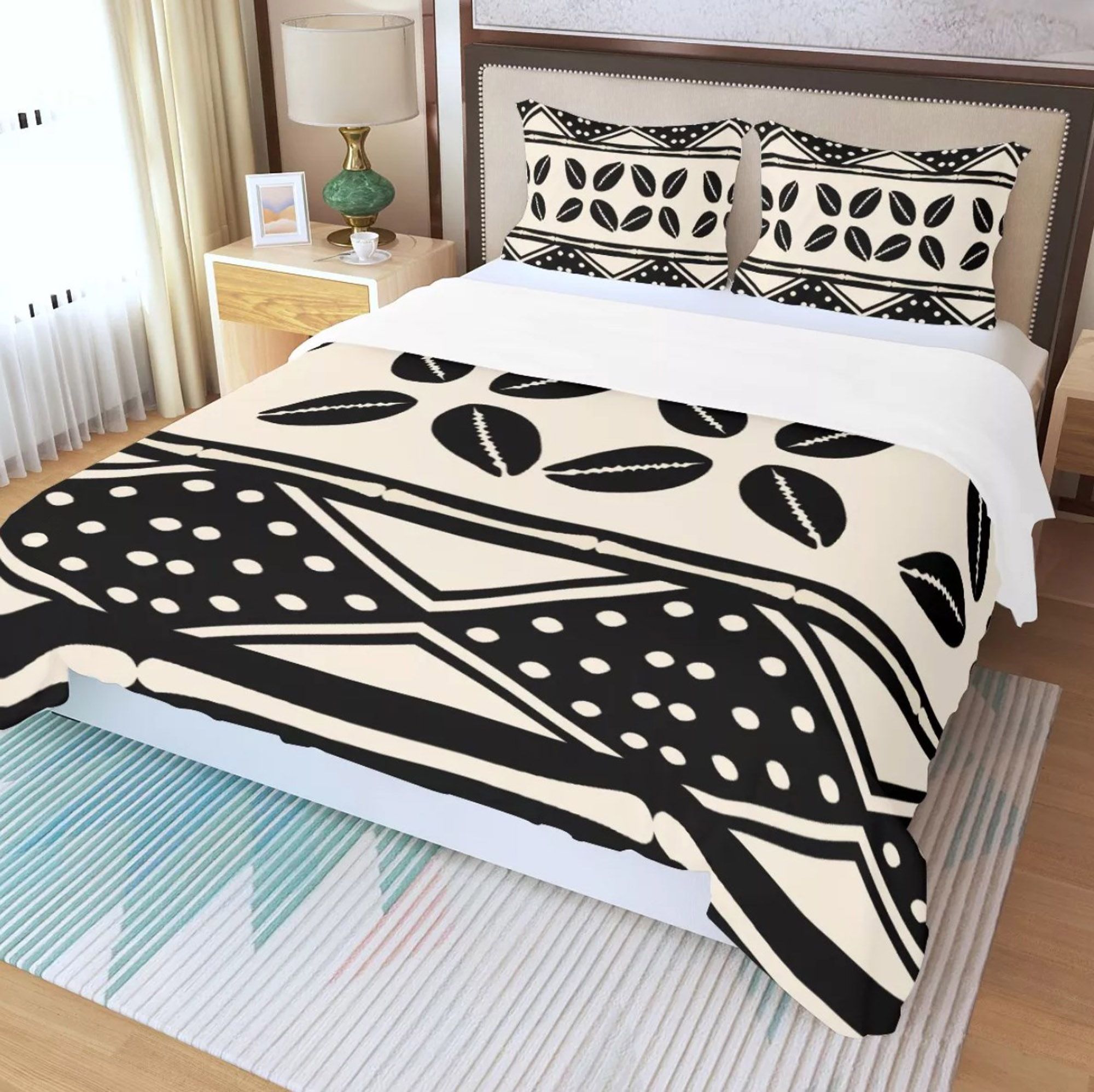 Lovely printed African bogolan mud cloth inspired three-piece duvet set. This striking African mud cloth adorned printed duvet bed set comes with 1 zip-up duvet cover and 2 pillow cases. The duvet and pillow cases are printed on one side only (the back side is white). The fabric is soft, non-irritating moisture absorption, breathable polyester. Insert your favorite quilt or comforter into this duvet cover and enjoy the great feel while making your bedroom looking astonishing!